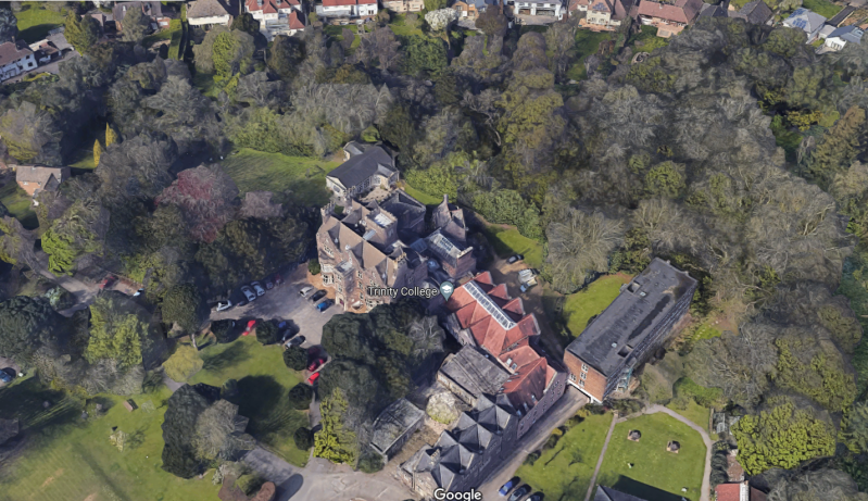 The chapel is the 't' shaped building. The gully ran behind left- right, the OAP home off to the right, and where the houses were at the top right was the walled garden.